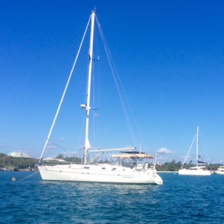 Satisfaction, where we live most of the year, moored in Fisher’s Bay, Great Guana Cay in the Bahamas