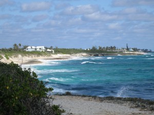 Today, Randolph’s son Pete runs the Johnston Gallery which makes life sized marine bronze statues of the local wildlife. To say that these bronze statues are collector’s items is an understatement. Pete opened an open-air pub and bar on the beach in Little Harbour which is a great place to go for lunch or dinner. The pub has a sandy floor and you really feel like you are on a remote island. We spent three days in Little Harbour touring the caves, the Johnston Gallery, walking the beach on the ocean side, and visiting an abandoned lighthouse which is in ruins today because of repeated beatings from storms. The first evening we had a potluck dinner with the other two boats that traveled down to Little Harbour with us on the very large powerboat named “Waylaid.” This powerboat is owned by Scott and Kathryn who are from Bermuda. The second night we ate at Pete’s Pub. There seem to be turtles everywhere in Little Harbour. We would see them stick their heads out of the water all day long while on our boat and we would see them swimming alongside our dinghy when we motored to shore.