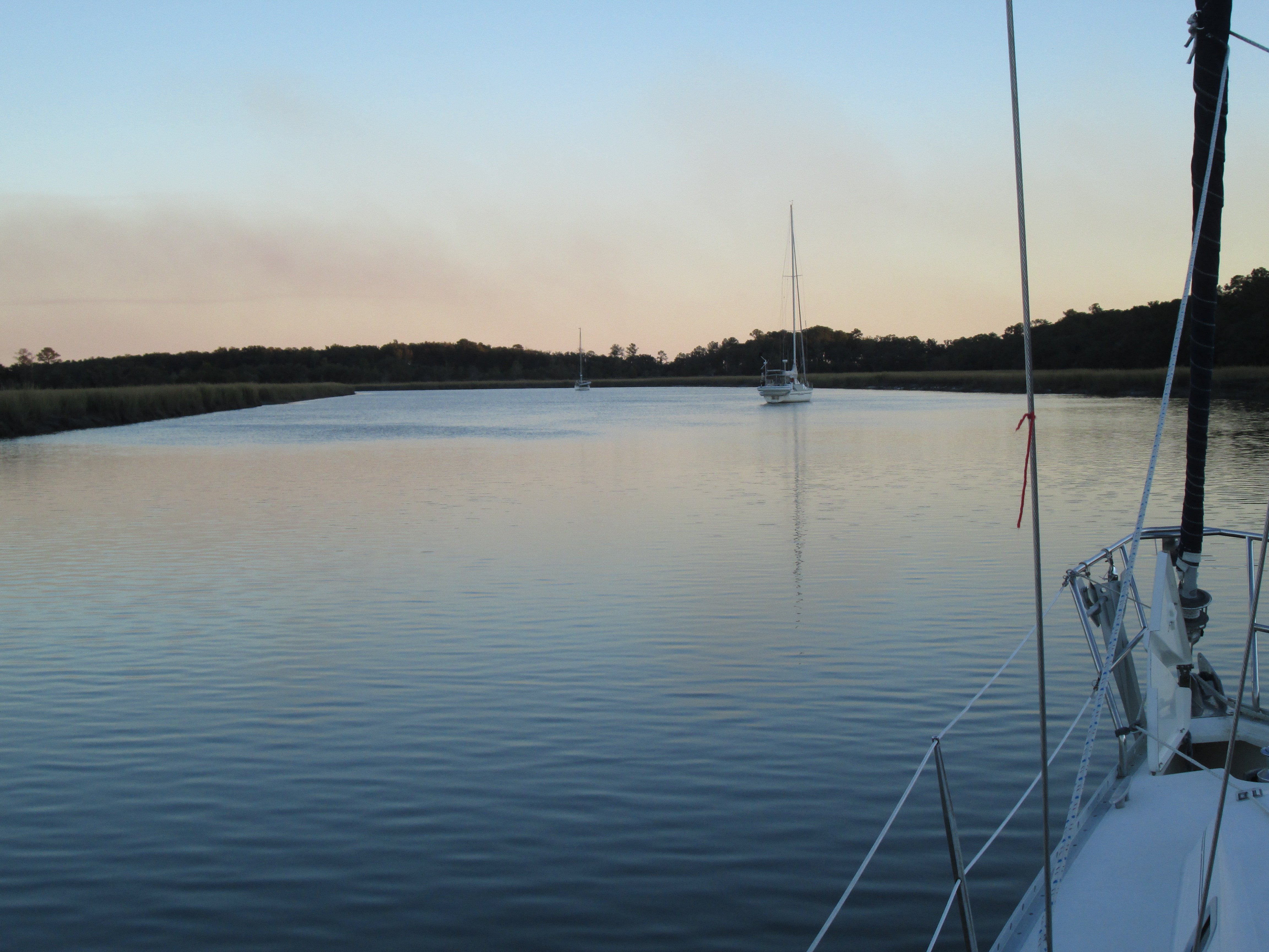 Mile 456.5 to Mile 495.7 (39.1 miles): We fueled up and departed the Isle of Palms Marina at 0830 hours and anchored out in a very nice spot called Tom Point Creek about 30 miles past Charleston. There were 4 other boats anchored out in this creek with us. The nighttime temperature was a little chilly (high 40s). Our vessel does not have any heat, but we had several blankets and were fine. This creek was very different from most other creeks in this area. Usually the creeks are very wide, but much of it is too shallow for a sailboat. Tom Point Creek is very thin (about 150 feet wide) but very deep (about 25 feet); and the depth carries all the way from shore to shore. The current was pretty strong here (the tidal change is 7.5 feet), but we had our “Sentinel Line” attached to the anchor line to be sure we would have no anchor problems.